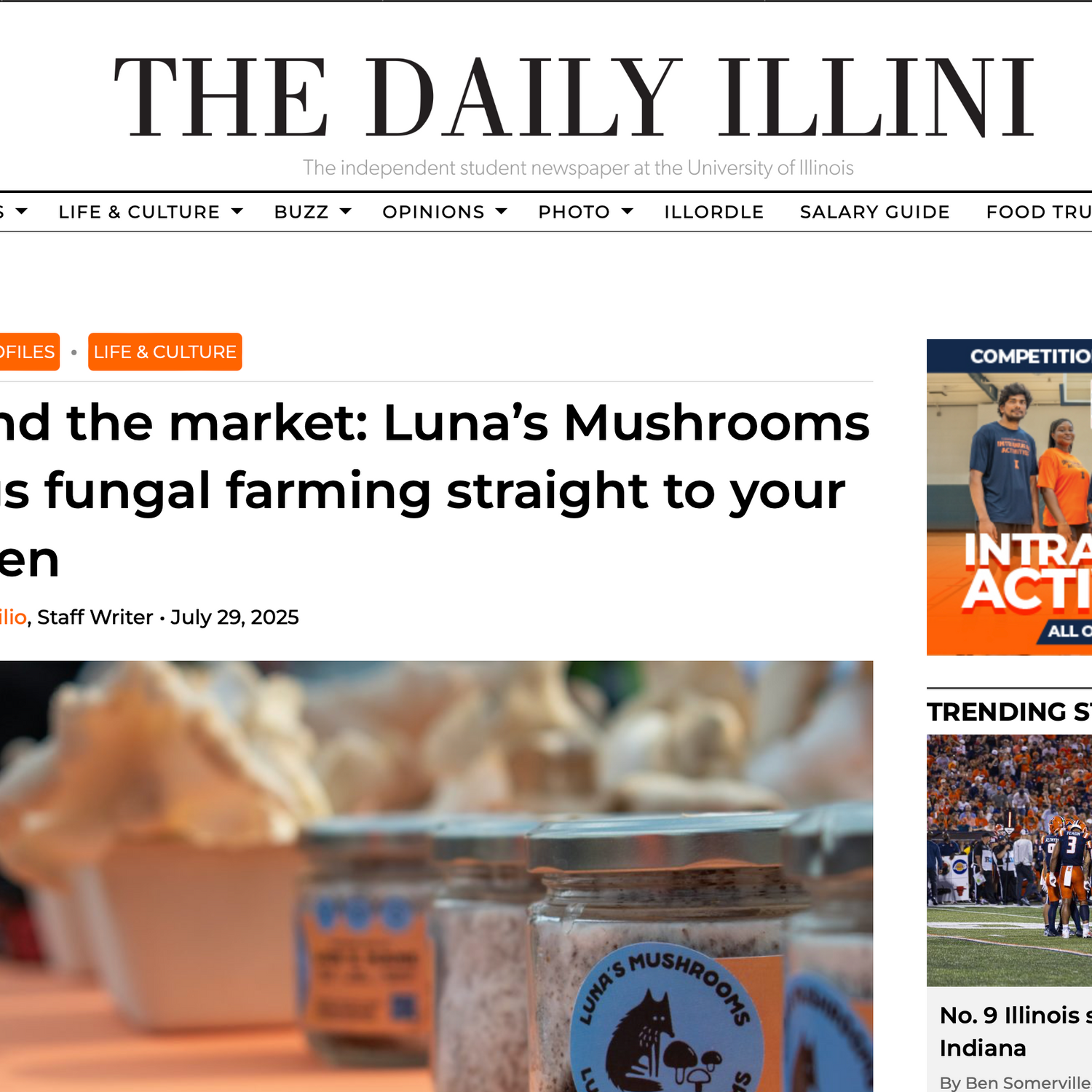 Lunaβs Mushrooms was featured in The Daily Illini, the University of Illinoisβ student newspaper. The article highlighted our growth as a local business, our commitment to sustainable mushroom farming, and how our fresh produce and growing kits are reaching both students and the wider Champaign-Urbana community.